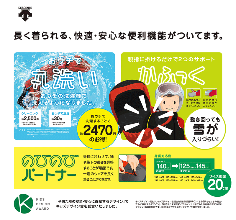 DESCENTE デサント ジュニアスキーウェア 上下セット/DWJOJH90 SNOW JAPANレプリカのジュニアスーツ身長に合わせて、袖や股下の長さを調整することが可能で、安心・安全・快適に配慮した機能を搭載。